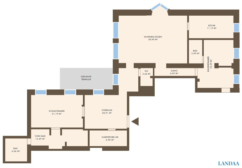 Die Möglichkeit zur Errichtung eines Balkons mit einer Fläche von ca. 15,23 m² ist gegeben, dieser wurde bislang jedoch noch nicht realisiert.