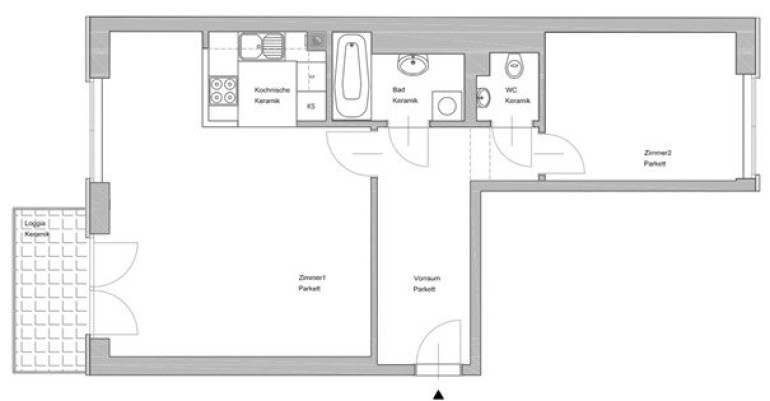 Vorzimmer, Wohnküche, Loggia, Schlafzimmer, Badezimmer, WC + Kellerabteil