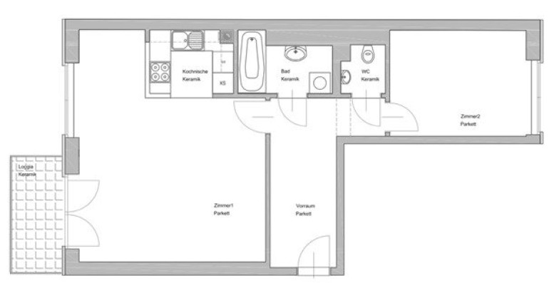 Vorzimmer, Wohnküche, Loggia, Schlafzimmer, Badezimmer, WC + Kellerabteil