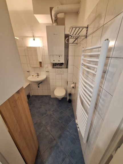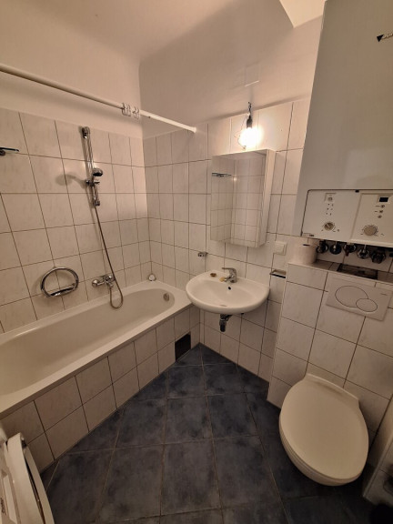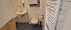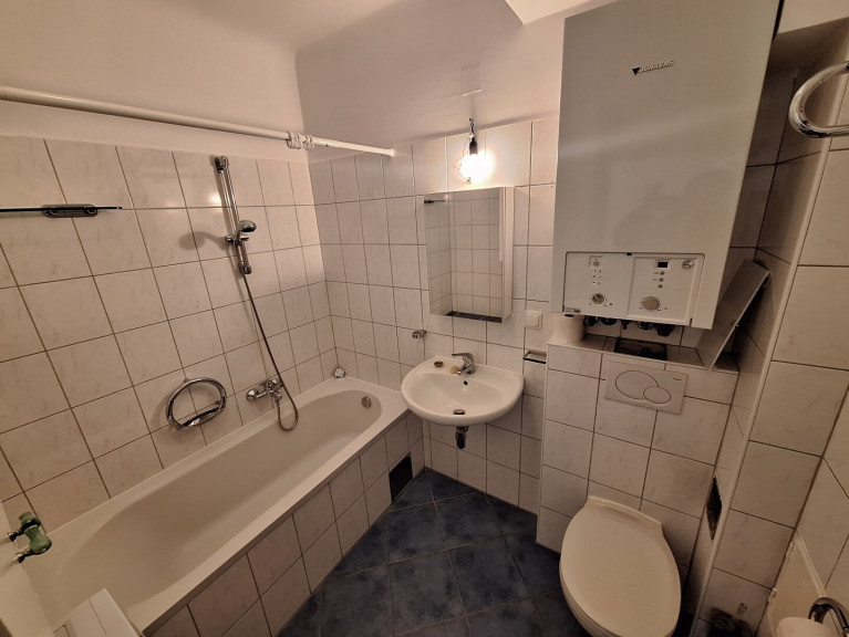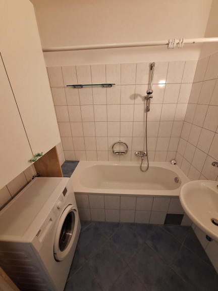 - Badezimmer mit Wannenbad, Handwaschbecken, WC, Waschmaschine