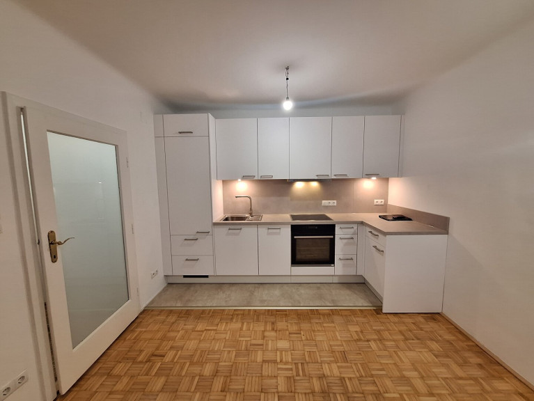 - moderne, offene möblierte Küche (Spüle, E-Herd, Backrohr, Dunstabzug, Kühlschrank mit Gefrierfach)