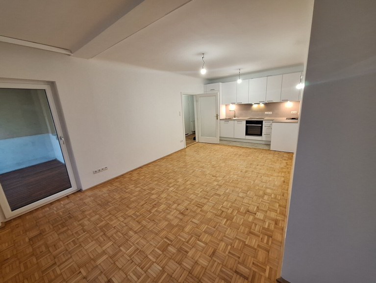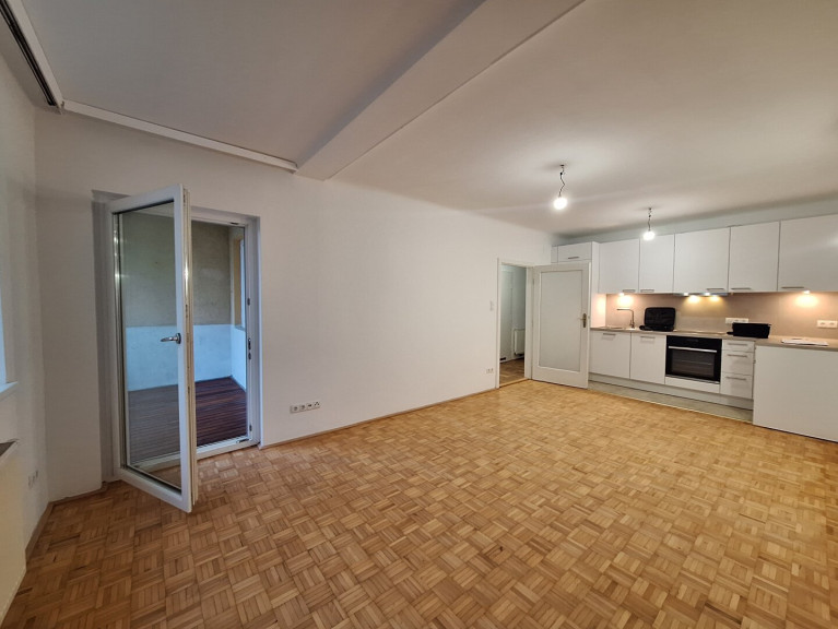 - Wohnzimmer mit angeschlossener Küche und Ausgang auf die Loggia