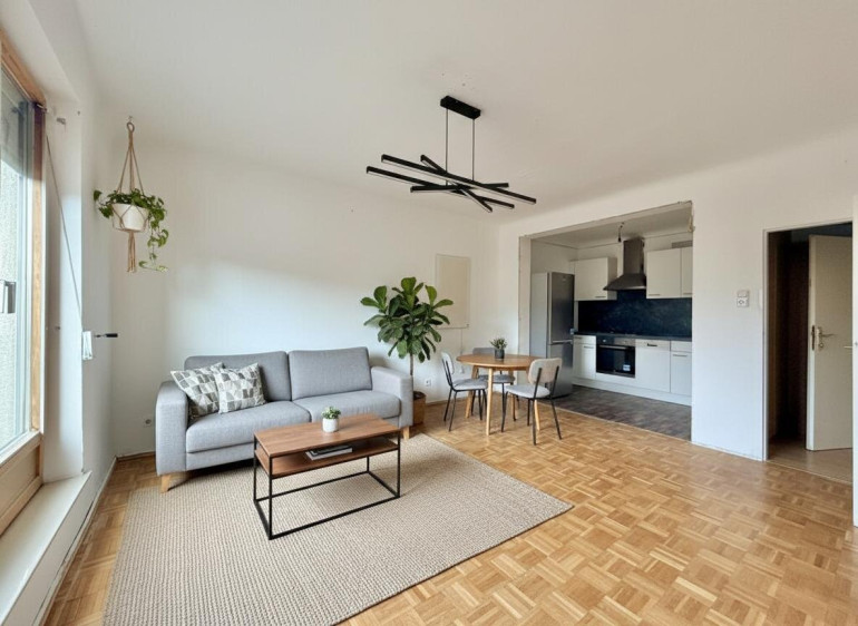 Aufgeteilt auf 2 Zimmer befinden sich auf 45m² Wohnfläche insgesamt 1 Schlafzimmer, 1 Bad (mit Badewanne, Therme und Waschmaschinenanschluss), 1 getrennte Toilette, und eine offen gestaltete Küche mit und direktem Zugang ins Wohnzimmer.