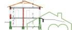 Im Erdgeschoss sind folgende Räumlichkeiten vorhanden: Windfang, Flur, WC, Bad, Wohnzimmer, Küche, Esszimmer, Eltern-Schlafraum, Kinder-Schlafraum, Gäste-Schlafraum sowie eine Terrasse. Die Terrasse ist teilweise durch den auskragenden Dachstuhl überdacht. Der Abgang von der Terrasse in den hofseitigen Garten erfolgt über eine einläufige Stiege mit Waschbetonplatten.