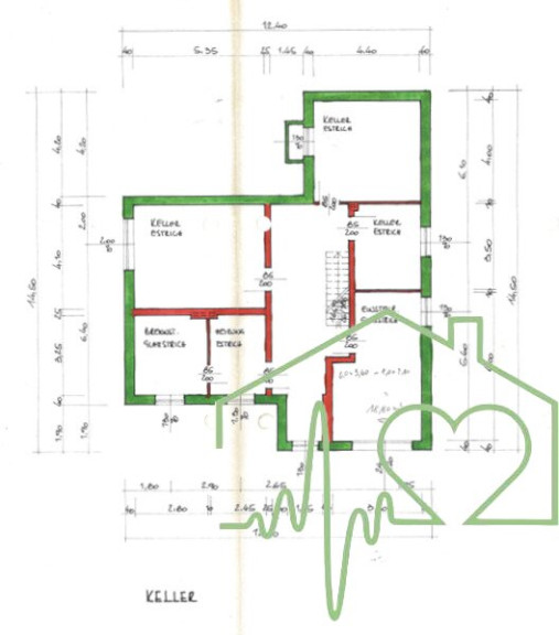 Im vollausgebauten Kellergeschoss befinden sich ein Vorraum sowie die Kellerräume 1, 2 und 3, Heizraum und Waschküche. Weiterhin ist im Keller eine Garage. Die Zufahrt zur Garage wird durch ein manuell bedienbares Metallkipptor ermöglicht.