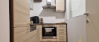 Die Küche beinhaltet ein Waschbecken, einen Geschirrspüler, ein Elektrokochfeld, eine Umluft, ein Backrohr, sowie einen Kühlschrank mit Gefrierfach.