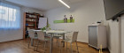 Die Küche beinhaltet ein Waschbecken, einen Geschirrspüler, ein Elektrokochfeld, eine Umluft, ein Backrohr, sowie einen Kühlschrank mit Gefrierfach.