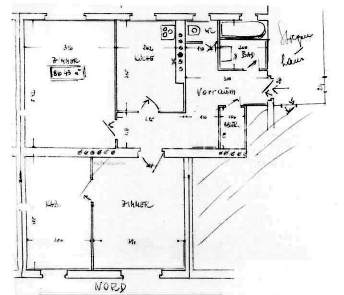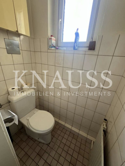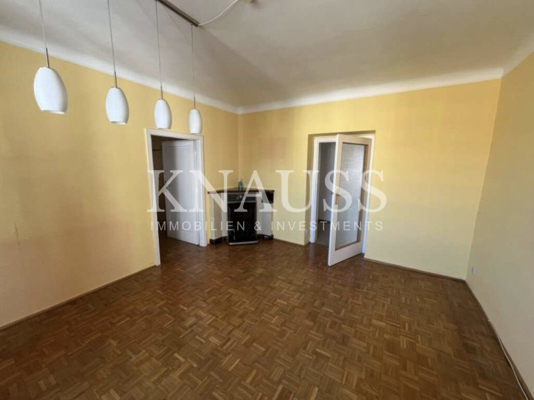 Die Wohnung ist sanierungsbedürftig und bietet entsprechendes Wertsteigerungs- und Anpassungspotenzial. Der Grundriss umfasst zwei große Zimmer sowie ein Kabinett. Die separate Küche ist großzügig ausgeführt und bietet Platz für einen Essbereich.