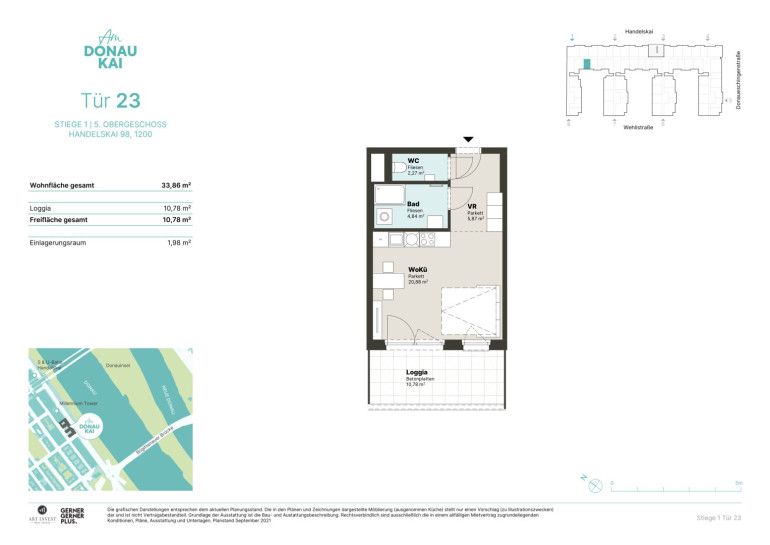 - öffentliche Anbindung: U6 & S-Bahn (Handelskai) sowie auch die Buslinien 5A & 11A