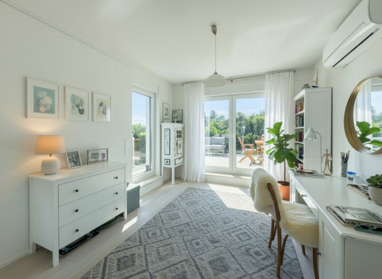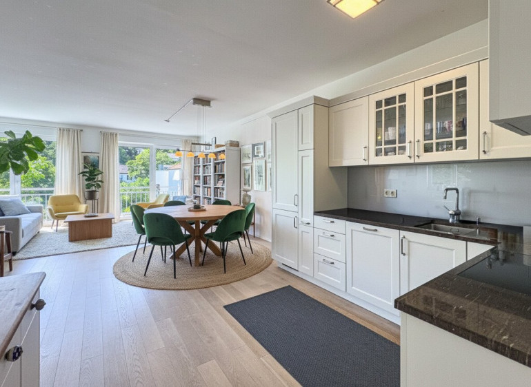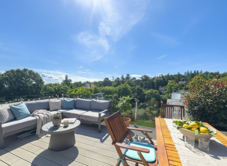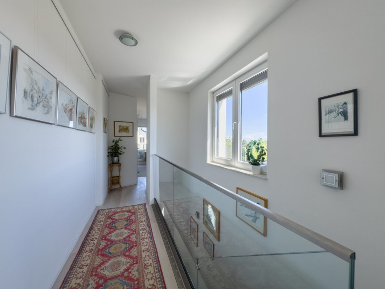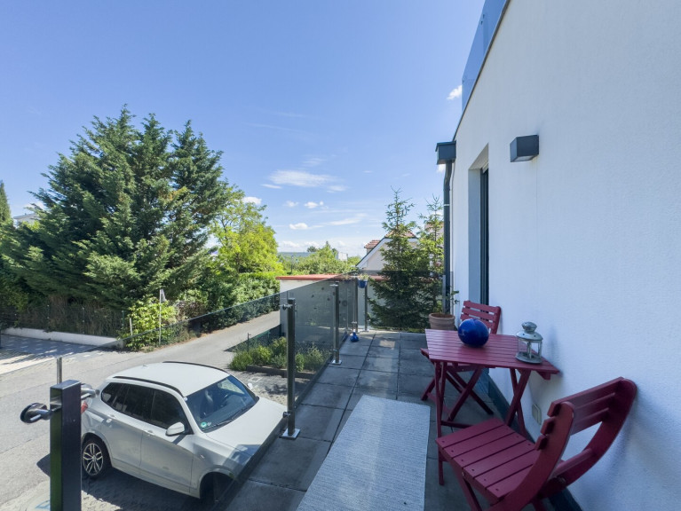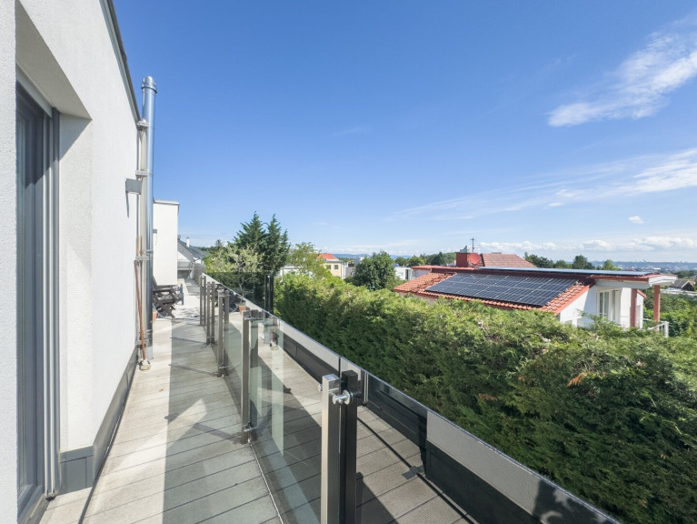 Die zweistöckige Architektenwohnung verfügt über eine perfekte Raumaufteilung. Vom Vorzimmer aus gelangt man in das lichtdurchflutete, offene Wohnzimmer mit Küche. Die drei Zimmer, welche als Schlaf-, Gäste- oder Arbeitszimmer ideal geeignet sind, liegen auf der Nordseite der Wohnung. Zwei davon führen auf einen schattigen Balkon. Eine begehbare Garderobe, ein Badezimmer mit Wanne und Dusche sowie das WC sind ebenfalls über den zentralen Flur zu erreichen. Folgt man den Treppen nach oben gelangt man in einen hellen, offenen Bereich mit einem weiteren Zimmer und einem Bad mit Dusche. Das Highlight bildet die Terrasse, welche das Dachgeschoss der Wohnung auf drei Seiten umschließt. Diese bietet einen wunderschönen Weitblick ins Grüne über Wien bis hin zur Hainburger Pforte.
