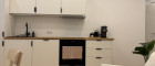 Die moderne Wohnküche ist mit einer neuen Küchenzeile ausgestattet. Ein Sofa sowie ein Esstisch sind bereits vorhanden und machen den Wohnbereich zu einem angenehmen Treffpunkt für gemeinsames Kochen und Verweilen.
