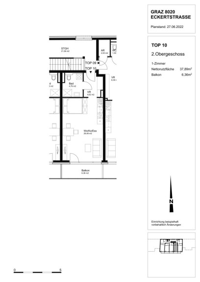 Der Grundriss, mit einer rd. 38 m² Wohnfläche, teilt sich in: