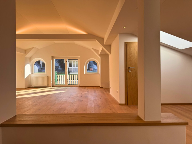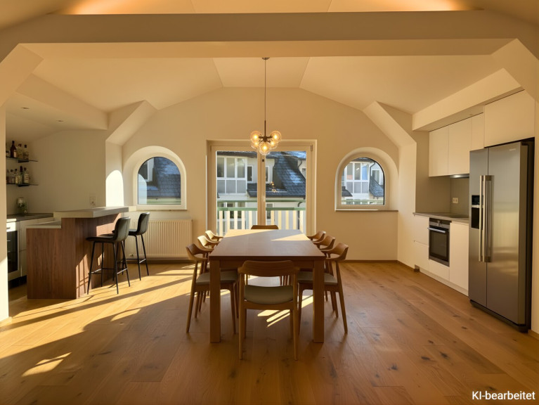 Beim Betreten spüren Sie sofort die Qualität der Revitalisierung. Warme Eichenparkettböden ziehen sich durch alle Wohnräume und harmonieren perfekt mit den freigelegten Dachbalken, die der Wohnung ihren Loft-Charakter verleihen. Das Lichtkonzept mit integrierten Spotlights und indirekter Voutenbeleuchtung setzt die Architektur zu jeder Tageszeit perfekt in Szene.
