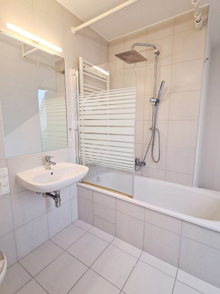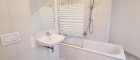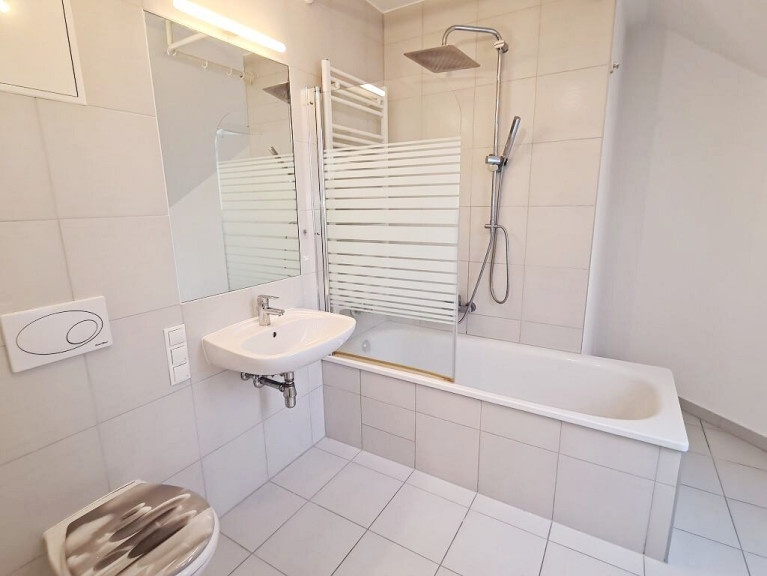 + Badezimmer mit Badewanne, Waschtisch, WC und Waschmaschinenanschluss