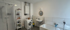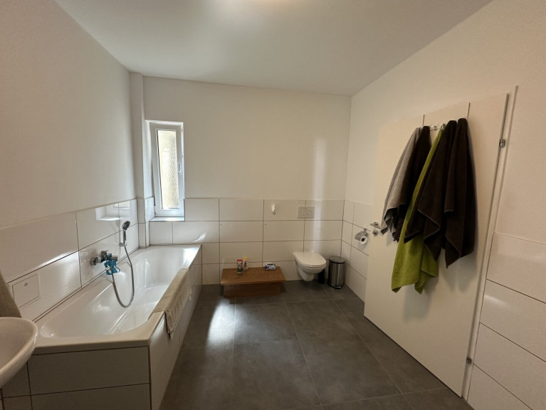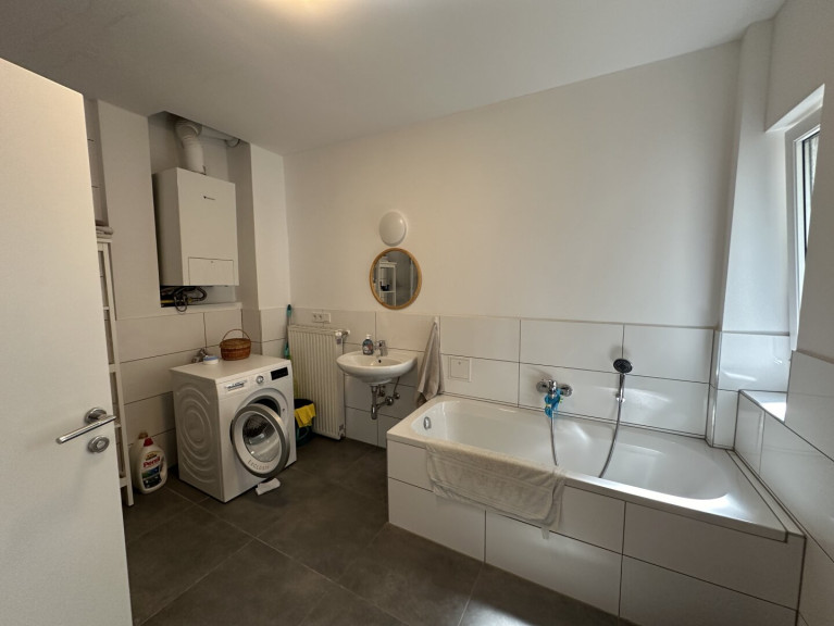 Beim Betreten werden Sie von einem einladenden Flur begrüßt, der rechterhand zu einem separaten WC mit Handwaschbecken führt. Nur wenige Schritte weiter, ebenfalls auf der rechten Seite, befindet sich das geräumige Badezimmer mit einer großzügigen Badewanne, einer Dusche, einem stilvollen Waschbecken, einem weiteren WC und einem praktischen Waschmaschinenanschluss.