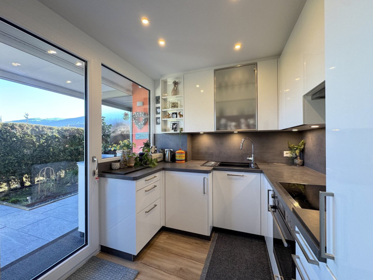 Der offene Wohn-/Essbereich mit integrierter Küche bildet das Herzstück der Wohnung und ermöglicht den direkten Zugang auf Terrasse und Garten. Große Fensterflächen sorgen für ein helles, freundliches Ambiente und verbinden den Innenraum harmonisch mit dem Außenbereich.