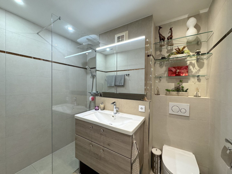 Der durchdachte Grundriss beginnt mit einem Vorraum mit Garderobe. Das Schlafzimmer mit begehbarem Kleiderschrank bietet viel Komfort und zusätzlichen Stauraum. Das modern gestaltete Badezimmer ist mit einer bodengleichen Dusche ausgestattet und wirkt dank zeitloser Materialien besonders einladend.