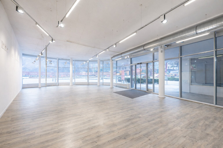 Die ebenerdige Geschäftsfläche mit rund 240 m² Nutzfläche zeichnet sich durch einen klar strukturierten, flexibel nutzbaren Grundriss, eine großzügige Raumhöhe von ca. 3,0 m sowie eine durchgehende Straßen- und Panoramafront aus. Die hohe Sichtbarkeit entlang der Einfahrt gewährleistet eine ausgezeichnete Außenwirkung und optimale Werbemöglichkeiten.