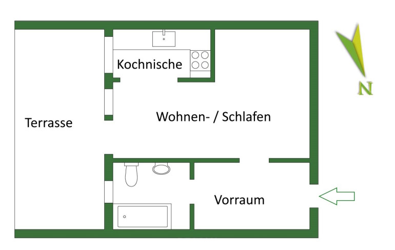 Die 30 m² Wohnfläche, mit Parkettboden im Wohnbereich und Fliesen im Nassbereich gliedert sich optisch getrennt in einen Wohn-Schlafbereich, eine separierte Kochnische mit neuen Geräten: Ceranfeld, Backofen und kleinem Kühlschrank. Das Bad mit einer Badewanne, kleinem Fenster und WC ist vom Vorzimmer begehbar.