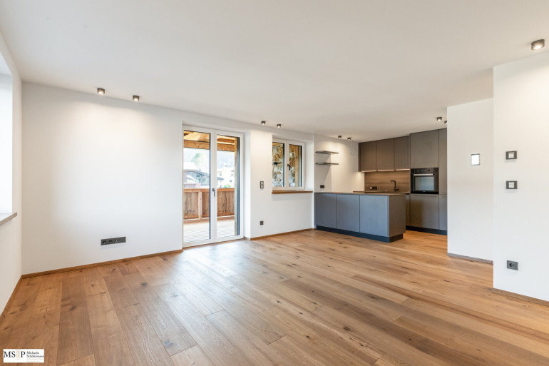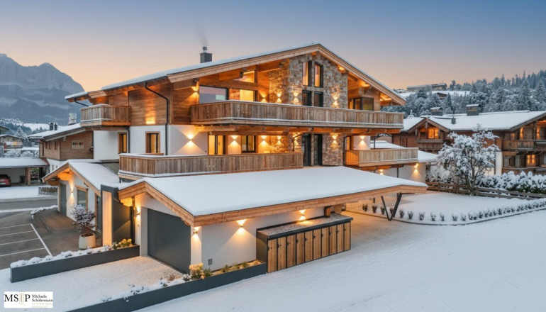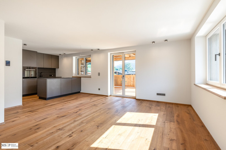 Die Wohnungen, beide im 01. Stock des Wohn- und Geschäftsgebäudes, bestechen durch einen traumhaften Blick auf das Massiv des Wilden Kaisers sowie mit Blick Richtung Süden auf den Hahnenkamm.