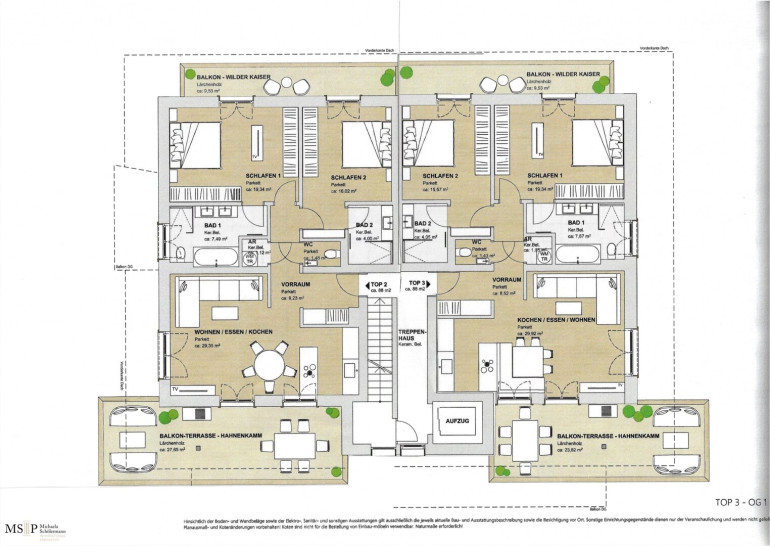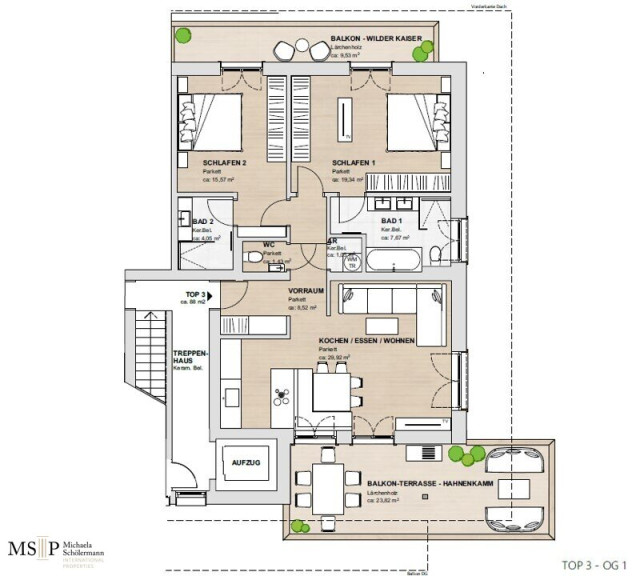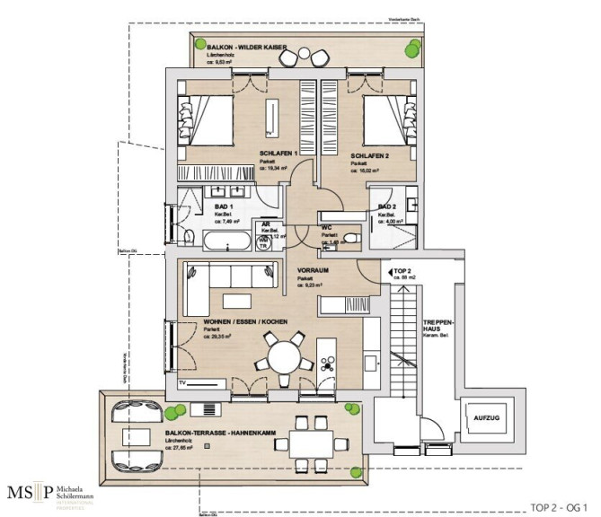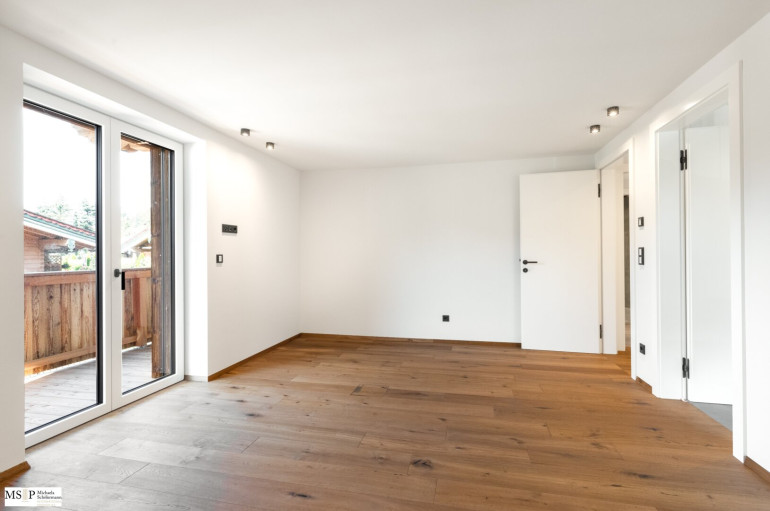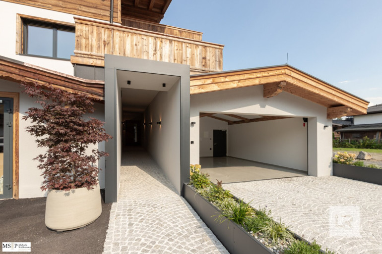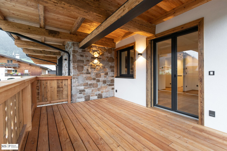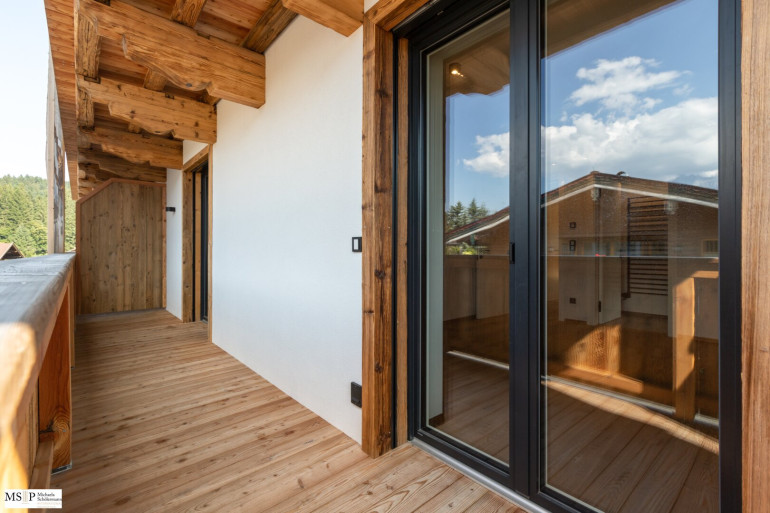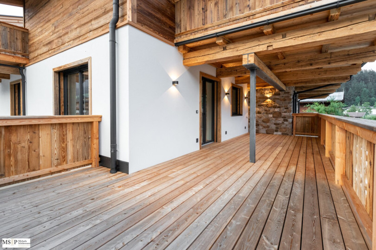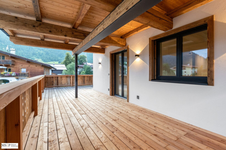 In beide Richtungen sind großzügige Balkone und Terrassen errichtet, wobei die Balkone Richtung Wilder Kaiser von den beiden jeweils mit en-suite Bädern ausgestatteten Schlafzimmern abgehen. Vorgelagert des jeweils ca. 30 m² großen, geräumigen Wohnbereiches sind die beiden Süd-Terrassen Richtung Hahnenkamm (jew. ca. 24 resp. 28 m²).