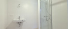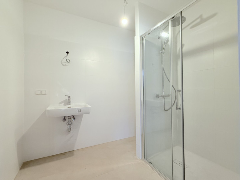 - Badezimmer mit Dusche, Doppelhandwaschbecken und Waschmaschinenanschluss