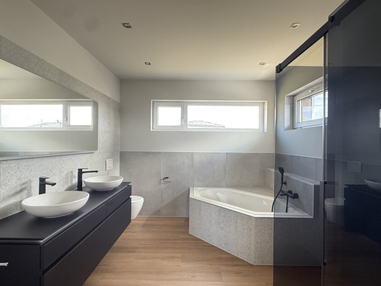 - Master Schlafzimmer mit begehbarem Schrankraum und Zugang zum Master Bad mit Eckbadewanne, Dusche, Doppelhandwaschbecken und WC