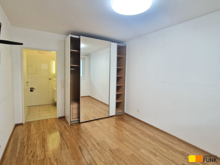 Die Wohnung befindet sich in einem Neubau (2010) in der vierten Etage, bietet ca. 62,6 m² Wohnfläche und verfügt über 2 Zimmer. Sie betreten die Wohnung über einen Vorraum, von dem Sie linker Hand Zugang zu einer begehbaren Garderobe und rechter Hand zum WC haben. Geradeaus gelangen Sie durch eine attraktive Glastür in die großzügige ca. 34 m² große Wohnküche mit Zugang zu dem ca. 14 m² großen, nach Westen ausgerichteten Balkon. Dort stehen Hochbeete zur Bepflanzung bereit. Die moderne und voll ausgestattete FM-Küche präsentiert sich neuwertig und verfügt über die erforderlichen Elektrogeräte. Von der Wohnküche aus gelangen Sie weiter in das ca. 15 m² große Schlafzimmer und das ca. 5 m² große en suite Badezimmer. Dieses ist mit Badewanne, Glasduschwand, Waschtisch, Spiegel sowie Handtuchheizkörper und Waschmaschinenanschluss ausgestattet. In den Wohnräumen ist Parkettboden, in den Sanitärräumen sind Fliesen verlegt.