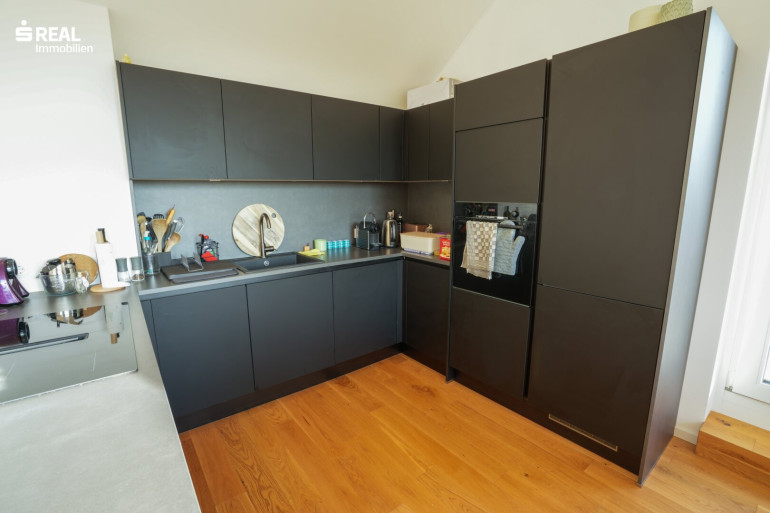 - maßgefertigte Tischler-Einbauschränke im Schlafzimmer, Vorraum sowie in der begehbaren Garderobe, hochwertige Einbauküche inkl. sämtlicher Marken-Geräte