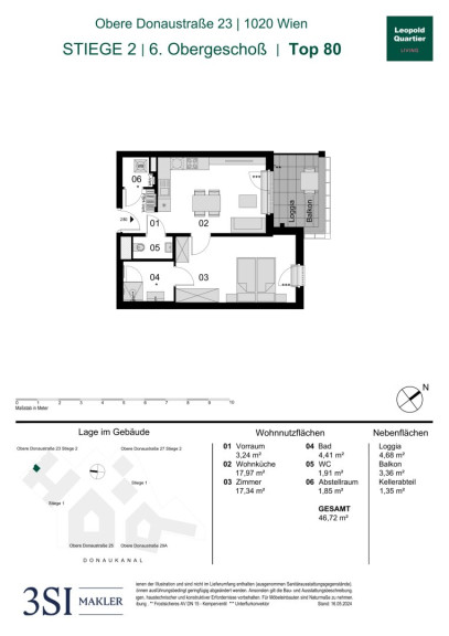 Diese moderne Wohnung befindet sich im 6. Obergeschoß. Die Einheit verfügt über eine Wohnnutzfläche von insgesamt 46,72 m² und bietet zusätzlich einen ca. 4,68 m² Loggia und 3,36 m² großen Balkon.