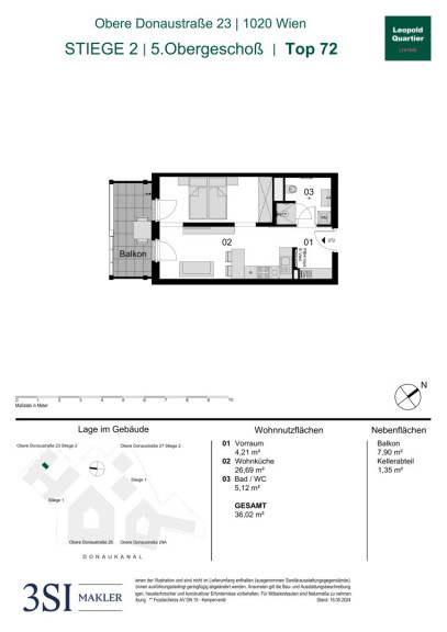 Diese moderne Wohnung befindet sich im 5. Obergeschoß. Die Einheit verfügt über eine Wohnnutzfläche von insgesamt 36,02 m² und bietet zusätzlich einen ca. 7,9 m² großen Balkon.