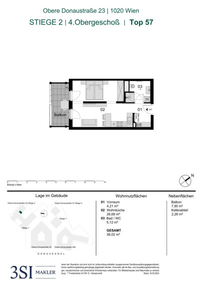 Diese stilvolle Wohnung im 4. Obergeschoß vereint modernes Design mit effizient genutztem Wohnraum. Auf 36,02 m² Wohnnutzfläche bietet sie ein durchdachtes Raumkonzept, das Komfort und Funktionalität optimal verbindet. Ein besonderes Highlight ist der ca. 7,90 m² große, südwestseitige Balkon, der den Wohnbereich erweitert und zu entspannten Momenten im Freien einlädt.
