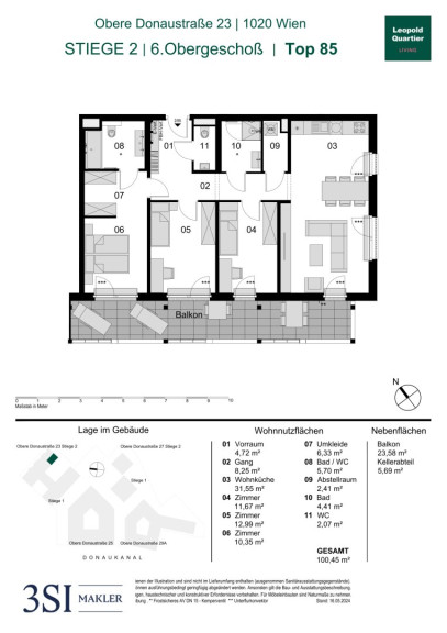 Diese moderne Wohnung befindet sich im 6. Obergeschoß. Die Einheit verfügt über eine Wohnnutzfläche von insgesamt 100,45 m² und bietet zusätzlich einen Balkon mit 23,58 m².