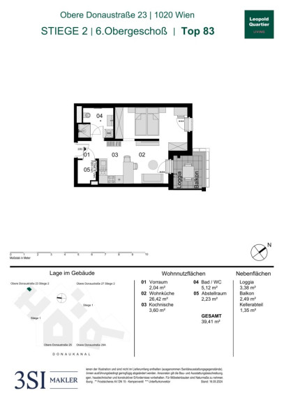 Diese moderne Wohnung befindet sich im 6. Obergeschoß. Die Einheit verfügt über eine Wohnnutzfläche von insgesamt 39,41 m² und bietet zusätzlich eine ca. 3,38 m² große Loggia und einen 2,49 m² großen Balkon.
