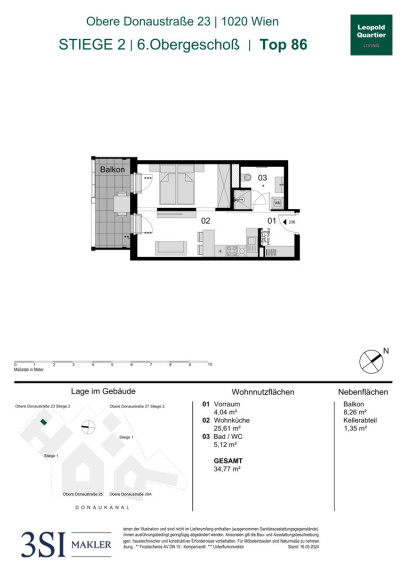 Diese moderne Wohnung befindet sich im 6. Obergeschoß. Die Einheit verfügt über eine Wohnnutzfläche von insgesamt 34,77 m² und bietet zusätzlich einen ca. 8,26 m² großen Balkon.