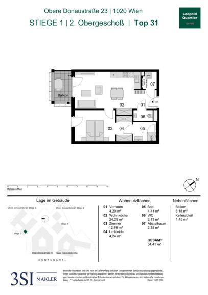Diese moderne Wohnung befindet sich im 2. Obergeschoß. Die Einheit verfügt über eine Wohnnutzfläche von insgesamt 54,41 m² und bietet zusätzlich einen ca.6,18 m² großen Balkon.
