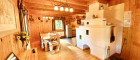 Ein großer Kachelofen sorgt für wohlige Wärme und lädt zum Entspannen ein. Dieser wird aktuell neu gebaut und ein Tischherd wird ebenso integriert. Eine gemütliche Couch, der TV-Flachbildschirm sowie der direkte Zugang zur Terrasse und in den Garten machen diesen Bereich besonders attraktiv.