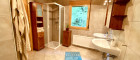 Das großzügige Badezimmer im Erdgeschoss präsentiert sich hell und modern – ausgestattet mit Badewanne, Dusche, zwei Waschbecken, WC und praktischen Stauraumlösungen. Ein zusätzliches WC sowie ein großer Abstellraum befinden sich ebenfalls auf dieser Ebene.