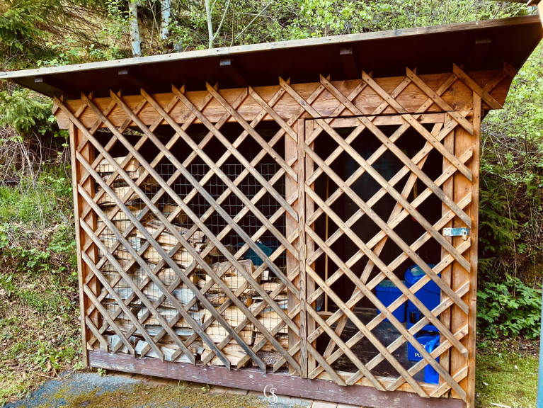 Der Außenbereich bietet eine eigene Terrasse mit Gartenmöbeln, einen Grillbereich sowie eine Holzlagerhütte mit ausreichend Brennholz. PKW-Abstellplätze sind direkt am Grundstück reichlich vorhanden.