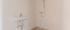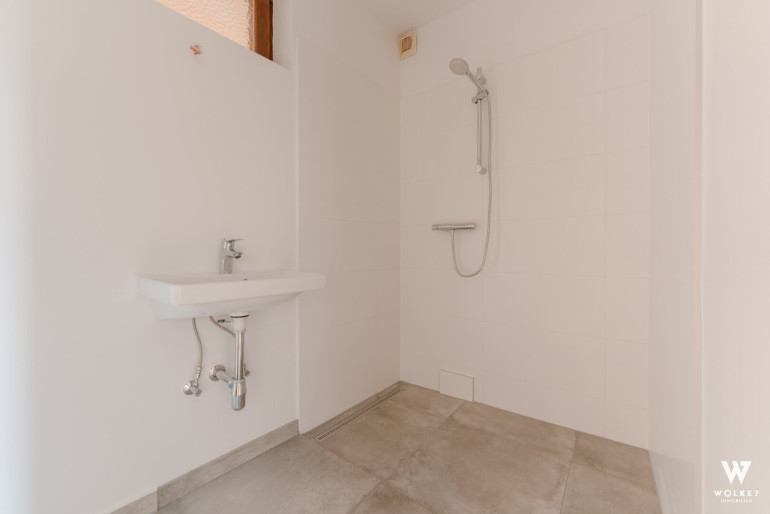 ein Badezimmer mit neuer, begehbarer Dusche und Waschmaschinenanschluss