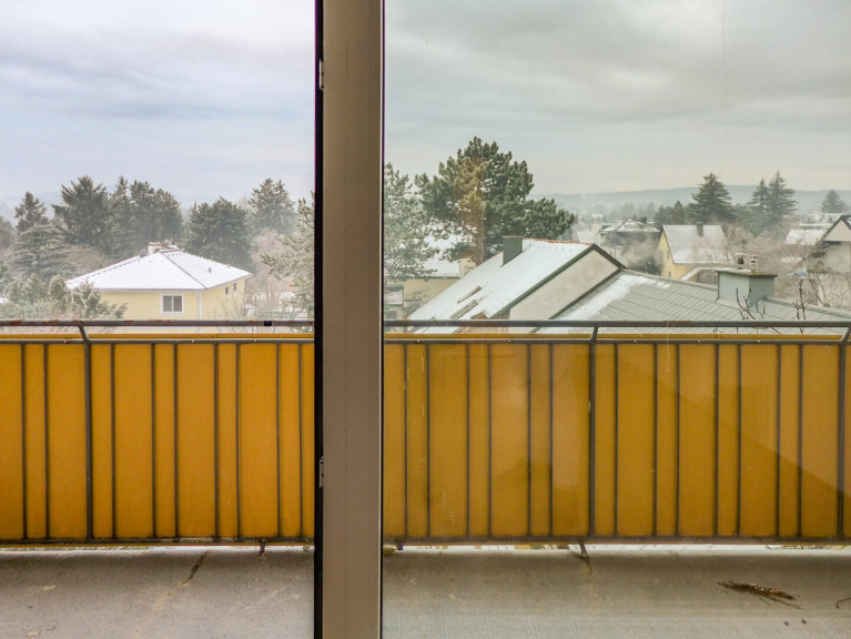 Den geräumigen Balkon betritt man ebenfalls direkt vom Wohnraum. Hier genießt man einen herrlichen Fernblick über die Stadt ins Grüne.