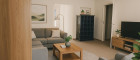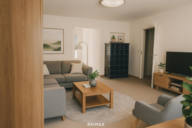 Die Wohnung überzeugt mit einer klar strukturierten Raumaufteilung auf einer Ebene: drei Zimmer, praktische Sanitärräumlichkeiten und ein Wohnbereich, der mit seinem Kamin sofort Wärme und Behaglichkeit ausstrahlt.