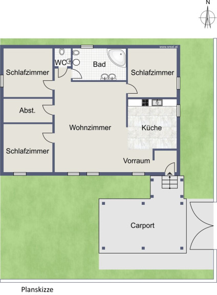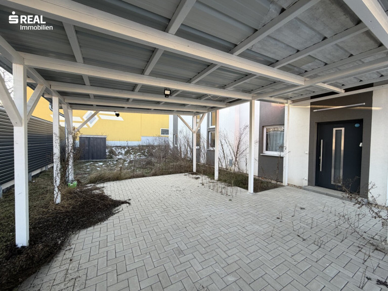 Ein überdachter Eingangsbereich und ein Autoabstellplatz runden das Angebot ab.