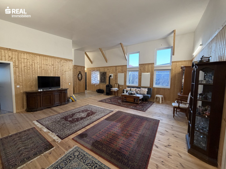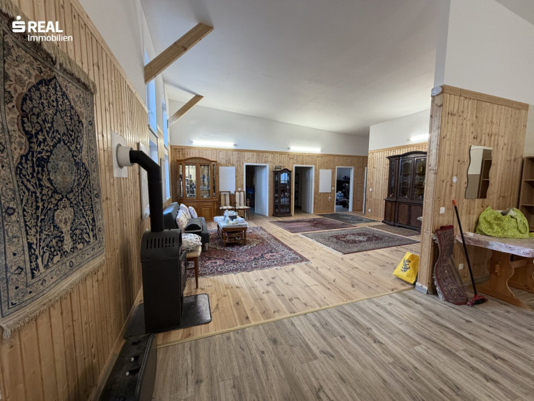 - Wohnzimmer ca. 47,55 m² mit einem Schwedenofen, der für wohlige Wärme sorgt