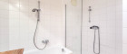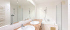 - Badezimmer mit Badewanne, Doppelwaschbecken und Waschmaschinenanschluss