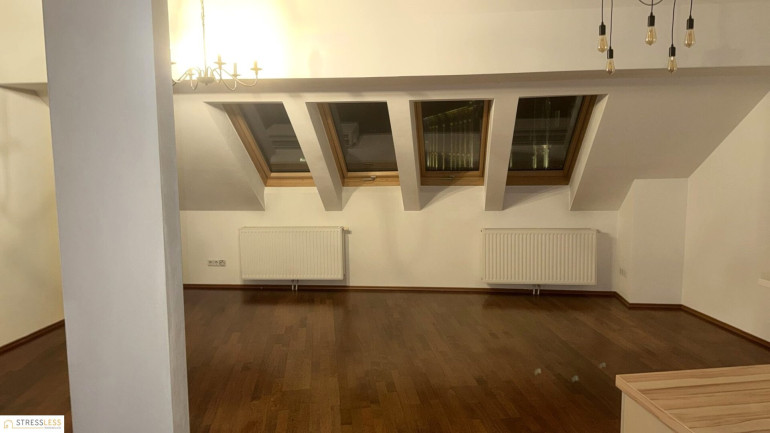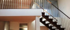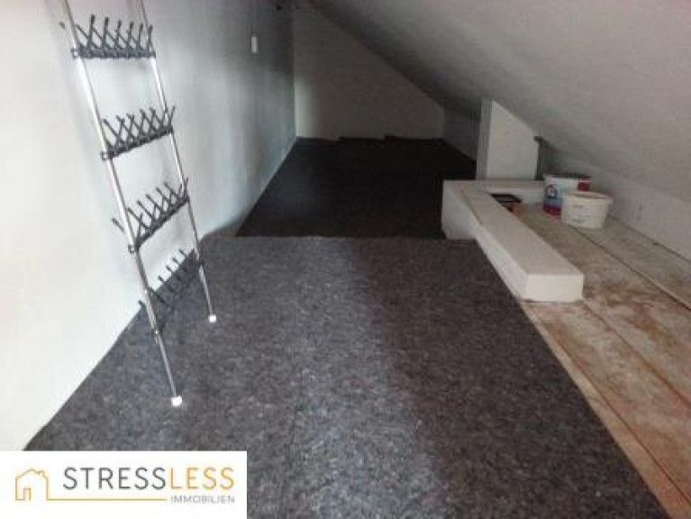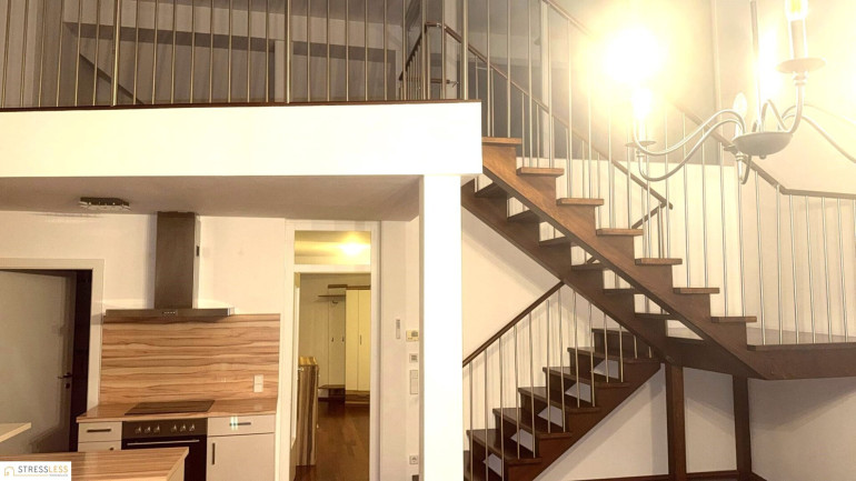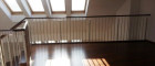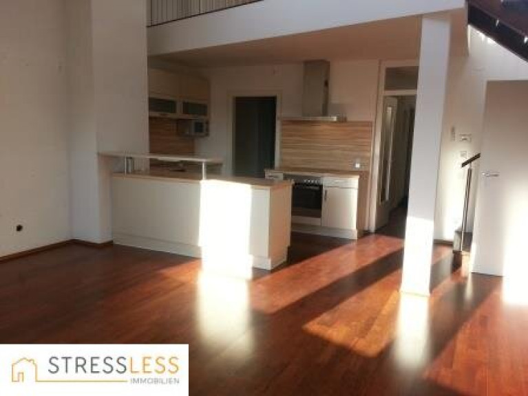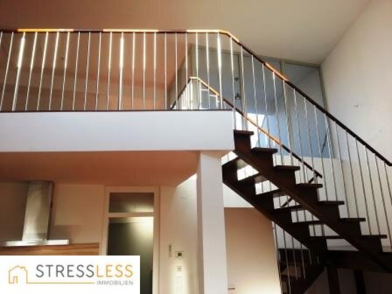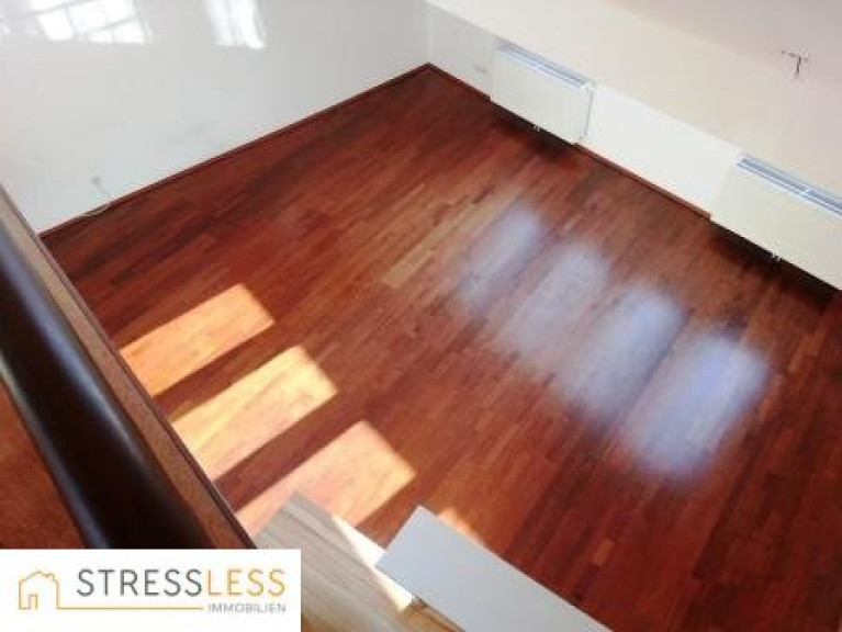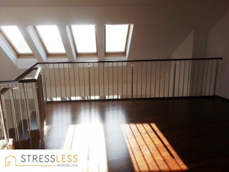 Über eine geschwungene Holztreppe gelangt man vom Wohnzimmer aus auf die obere Etage, hier befindet sich eine luftige Galerie, ein rund 35 m² großer Dachboden (Stauraum), sowie der Ausgang auf die Loggia, bzw. vorgelagerte Terrasse (13 m²).