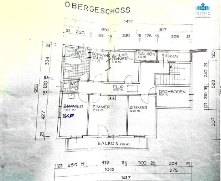 Das Obergeschoss mit einem Ausmaß von ca. 83,93 m² verfügt über drei Zimmer, zwei Bäder, einen Schrankraum, ein WC und den Flur. Im Obergeschoss gibt es außerdem noch einen ca. 8,26 m² großen ausgebauten Dachraum mit Zugang zum Kriechdachboden.