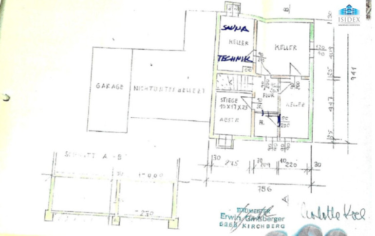 Der Keller verfügt über ca. 58,18 m², mit zwei "klassischen Kellerräume", und einer Waschküche. Des weiteren noch einen Raum, wo sich eine Sauna und die Haustechnik befindet sowie eine Dusche/WC.
