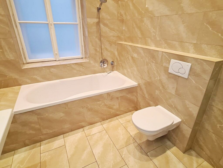 + Badezimmer mit Badewanne, Dusche, Doppelwaschtisch, Sprossenheizkörper und WC