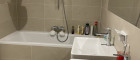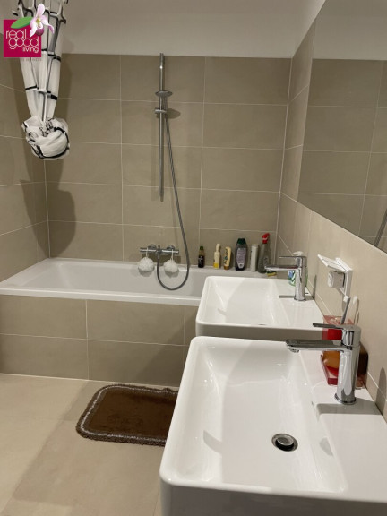 - Badezimmer mit 2 Waschbecken und Badewanne